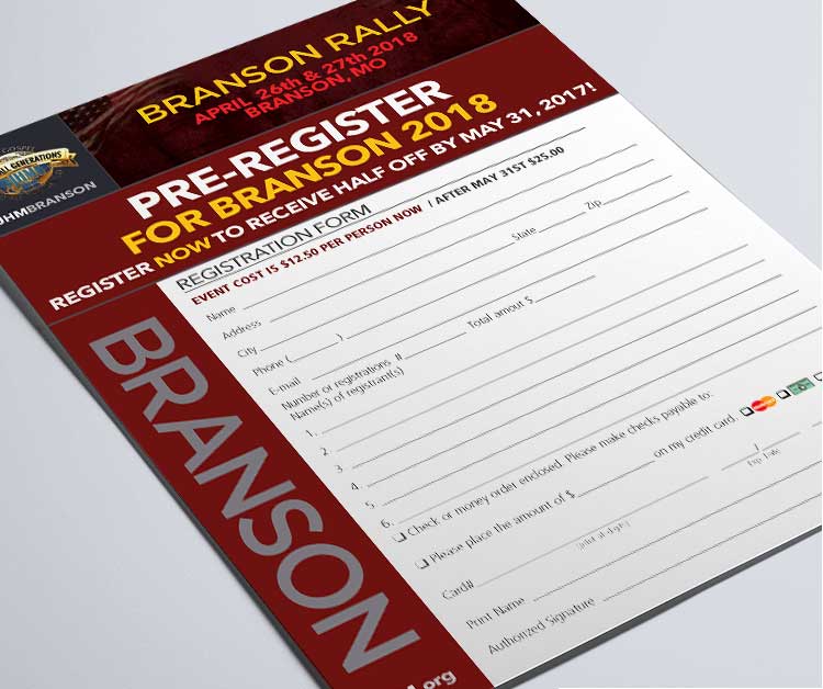 Our creative team works daily with the staff at HM to fulfill their mission and build on its philosophy by reaching everyone from every walk of life, where they currently are with the redeeming news of Jesus. We work to complement their message and spread the gospel throughout all outlets and each year we take the Gospel “on the road” to several different locations. Branson is known for its live entertainment that draws millions of visitors each year. Many of the visitors are seniors who are very patriotic and love their country. Over the last ten years, we have held many rallies in Branson, MO but one of most successful Branson rallies was a 3-day event called the “Righteous Revolution” held at the Branson Convention Center. It was three days full of music, great speakers, fellowship and the Word of God. Like all out-of-state events, marketing and media buying becomes a crucial piece to the puzzle to ensure a successful event as well as the collateral marketing leading up to the event such as registration materials, VIP invites, posters, direct mail, social media, signage, billboards, specialty and promotional items and show graphics. Hundreds of hours of marketing lead up to the final 3-days and a sold out convention center is what makes our job so rewarding.