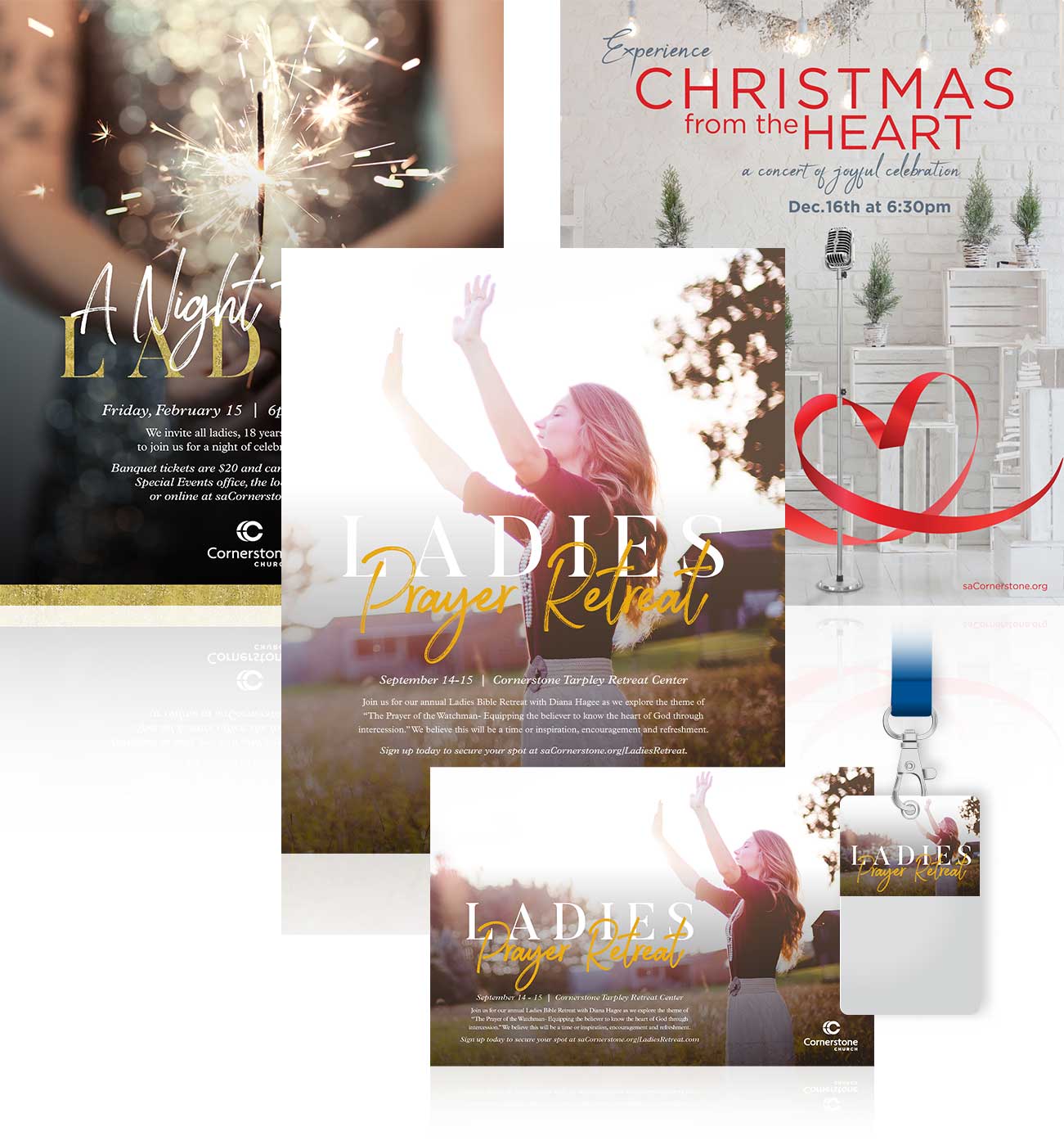 The team at Rudkin Productions, between our account executive and skilled team of designers, focuses on providing personal customer service and a cohesive brand on a daily basis. We work each week to help promote through marketing church events as well as upcoming sermons and teachings to help visually portray scripture and biblical concepts. Once the initial concept is designed of the sermon series, we are then able to implement into many mediums print, digital as well as televised programming.
