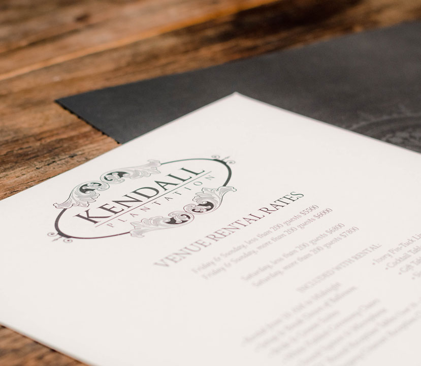 The Kendall Plantation team wanted to market their impressive two-story, Antebellum-style venue in a way that exuded the event space’s elegance. Our team took their vision and created pieces that made you feel like you were walking into the venue itself. A simple yet impactful design mimicked throughout each piece transforms you to a time forgotten, where hospitality is coupled with unforgettable service.
