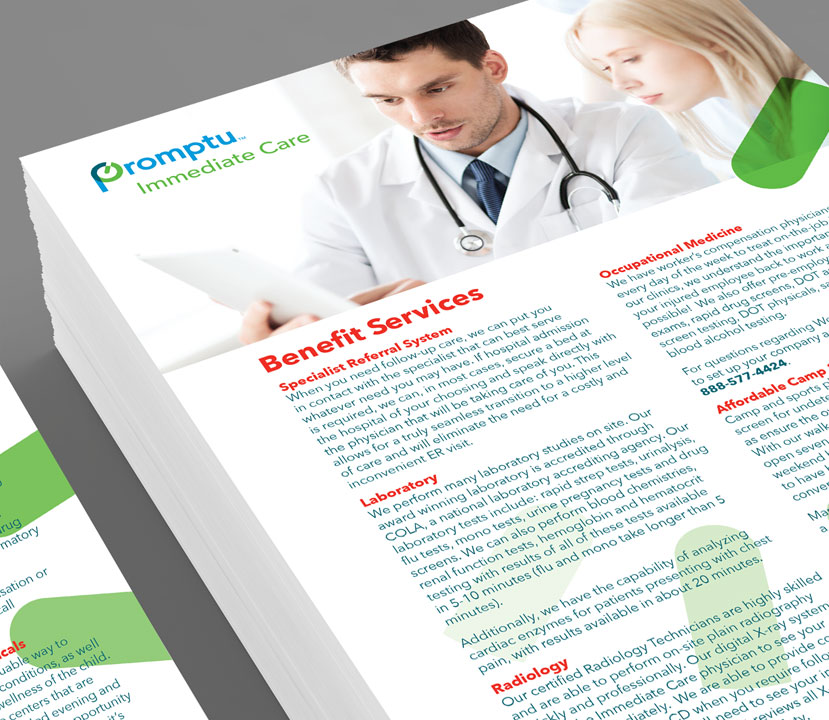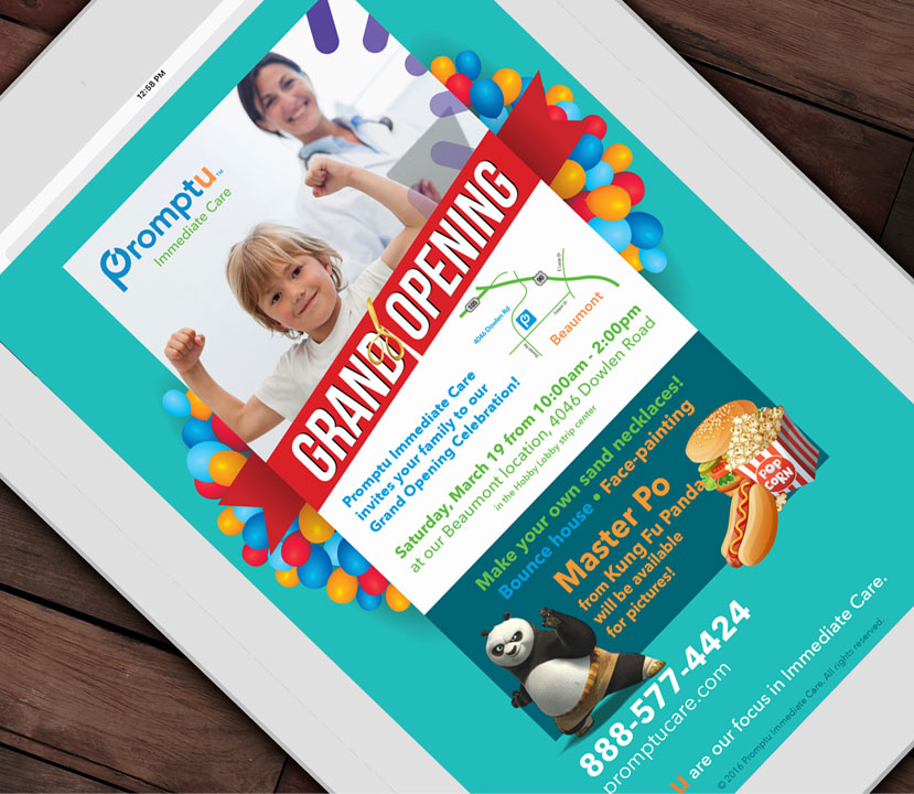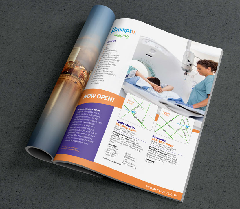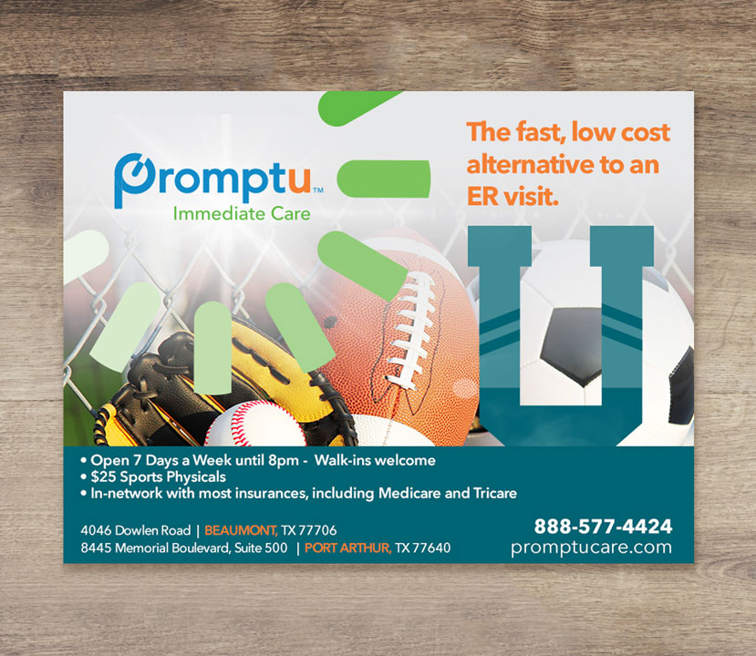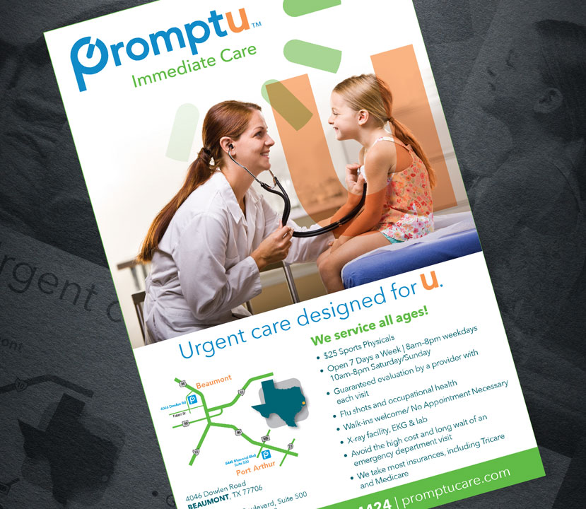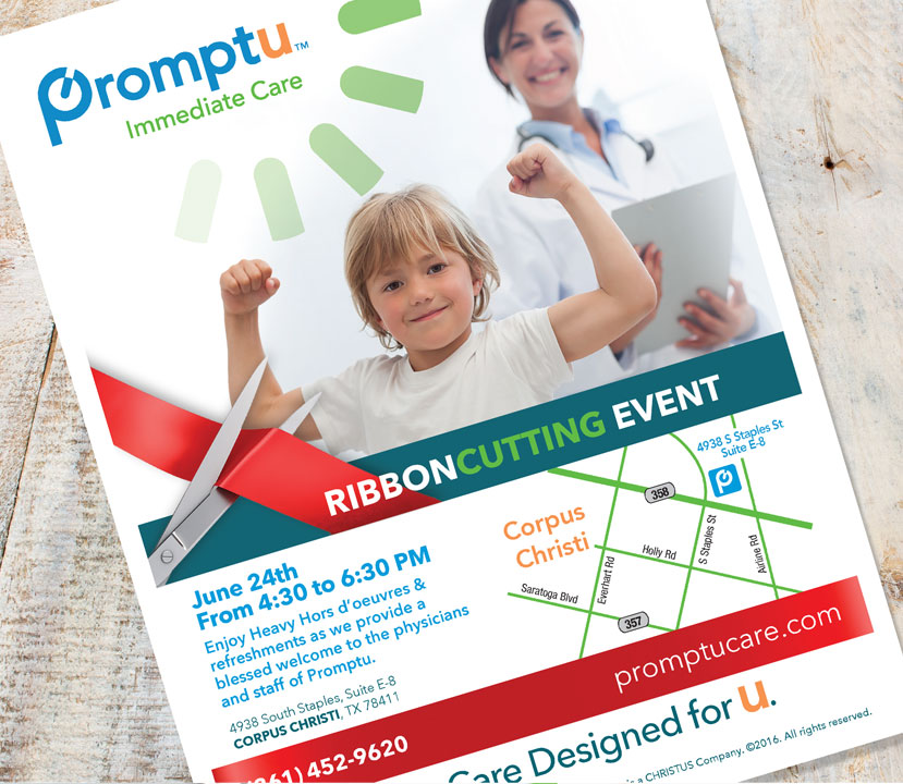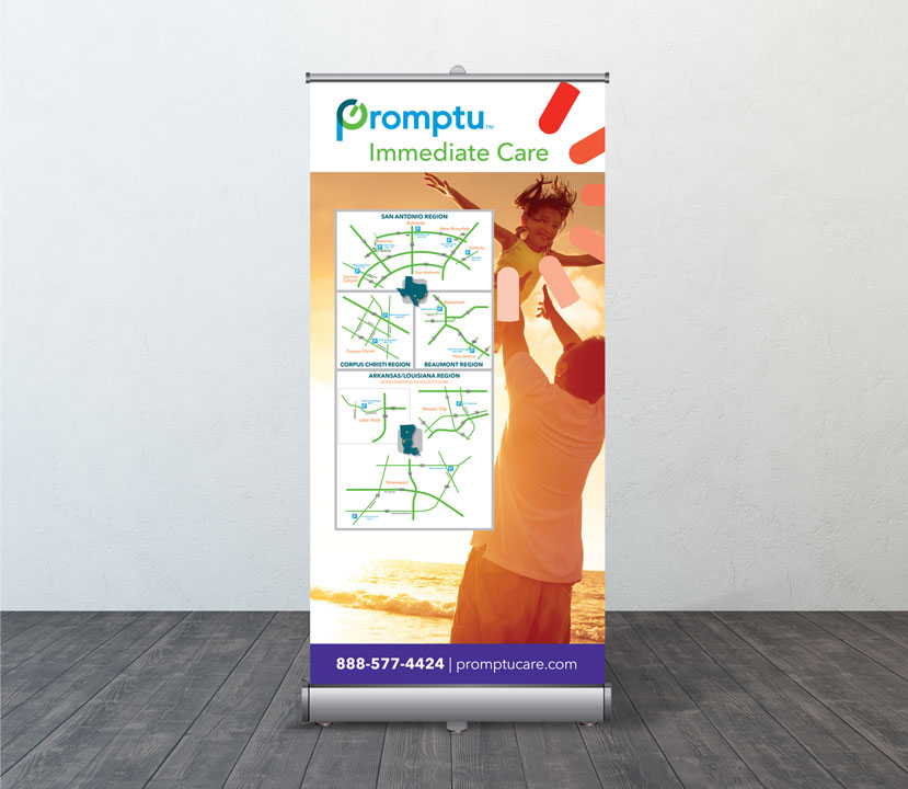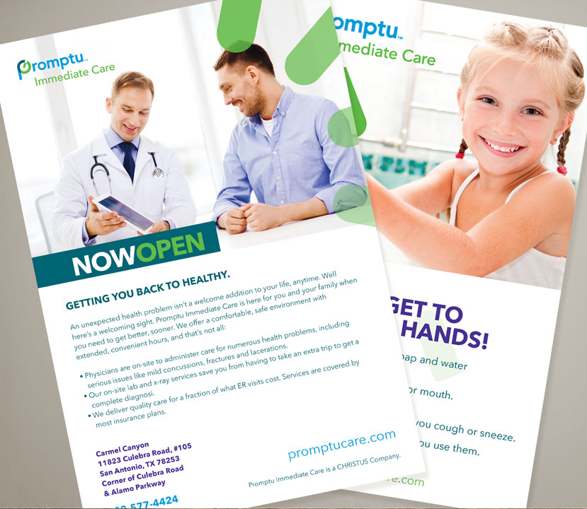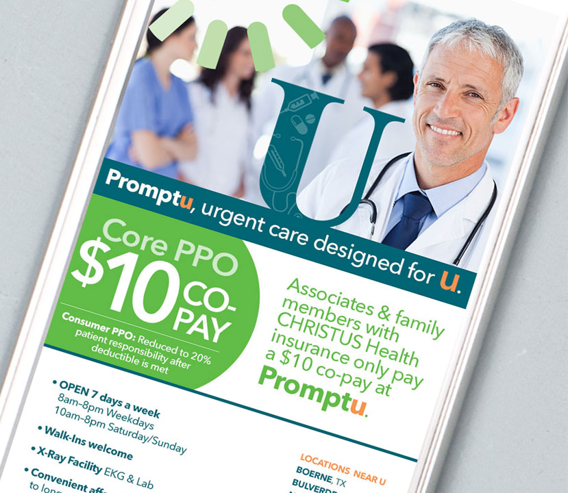 Christus Health bought out many of the Hill Country premier Urgent Care facilities and found themselves in a slightly different scenario of marketing than in the big city. Since we had represented this local chain of Urgent Cares since inception, we knew their clientele and how to reach a rural market without the means of traditional advertising. The client’s goal was to create informative and user-friendly platforms for its brand and continue with the great service the facilities had offered in the past under different ownership. Our team executed inviting pieces that did just that and made for a seamless transition of the new ownership while keeping the same great hometown service. A cool color scheme that displayed its principles of service were evident throughout the marketing. Once they experienced our customer service, it only made sense for us to help other Promptu clinics in other areas with some of their marketing pieces.