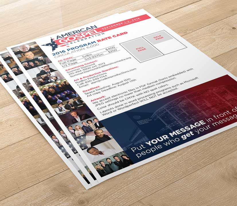 Each night had a special pre-show event with eat-and-greet with performers, food trucks, giveaways and more. We developed the event brand to be ultra-patriotic with the focus of portraying the body and soul of America. With the Americana vibe branding, displays and collateral materials, The American Gospel Celebration was an amazing event and encouraged all who attended to celebrate their faith and freedom.
