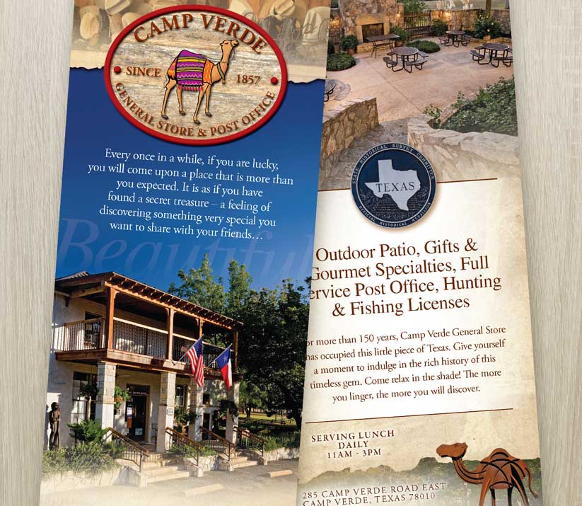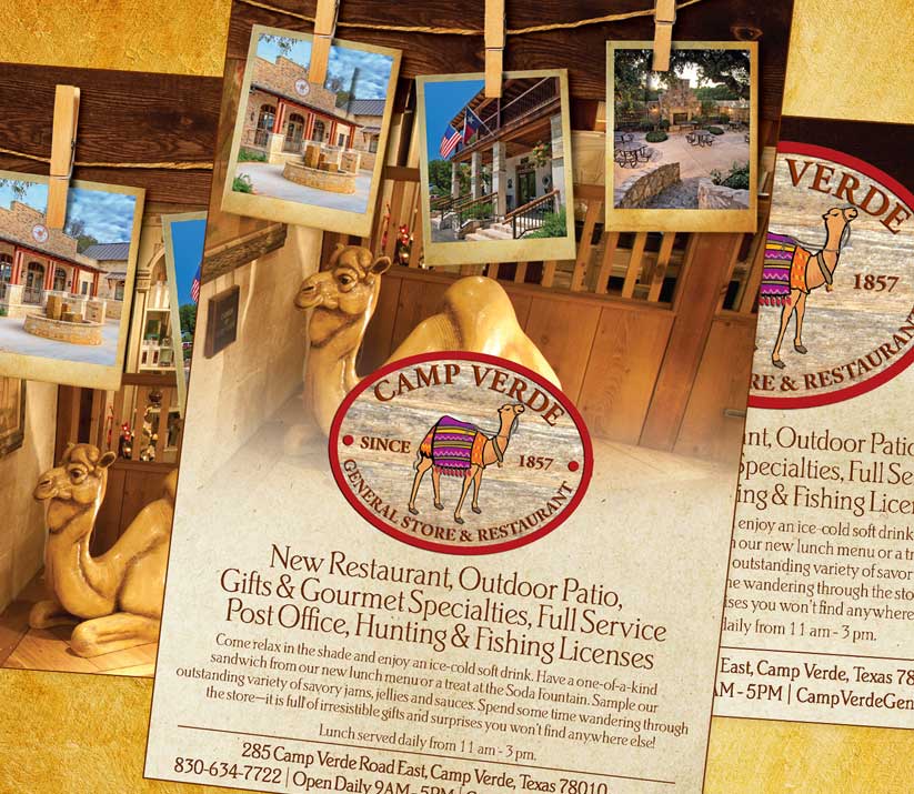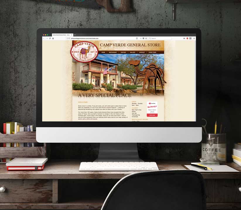 Rudkin Productions leveraged a piece of Camp Verde General Store’s history to create a memorable brand. A colorfully decorated camel serves as the centerpiece of a timeless horizontal oval logo design. An all-capitalized, serif font further harkens back to traditional signage from eras gone by. A rugged yet polished color scheme and layout style run through the client’s Website, marketing brochures, direct mailers and many traditional advertising designs to capture the rich history of a timeless frontier gem. Our professional photography shoot brought new life to each of these marketing elements, showcasing the timeless beauty of the property as well as the vibrant findings inside the store and restaurant.