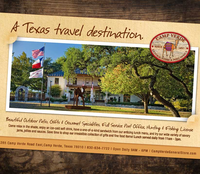 Located in the Hills of South Central Texas, Camp Verde General Store & Restaurant offers an unexpected oasis to hill country travelers. Within the last two decades, new proprietors have revitalized an establishment that dates back 150 years. A former supply post for a nearby U.S. Army camp once tasked with testing the viability of camels - yes, camels - in military maneuvering, Camp Verde General Store now offers uniquely-sourced gifts and delectable country fare. Visitors can enjoy an ice cold Coca-Cola, fresh-popped corn, homemade cookies or a complete made-from-scratch lunch. Positioned above the tree-lined Verde Creek, a two-story Southern colonial stone structure creates the framework for guests to go back in time and back to quality.
