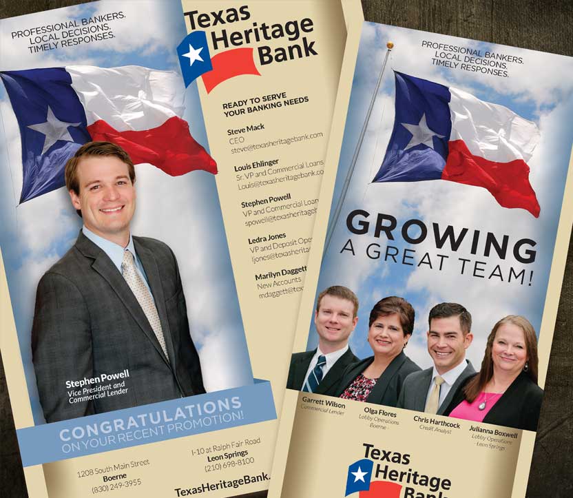 Rudkin Productions helped Texas Heritage Bank capitalize on the strength of its roots. With warm and inviting brochures, print advertising and direct mail, Rudkin positioned the bank as friendly and responsive. It also highlighted the bank’s history of independence and local decision-making. Marketing materials appeal to a recipient’s Texas pride while promoting the convenience of the bank’s modern financial technology tools. Customers can bank on Main Street and still enjoy many of the sophistications of Wall Street.